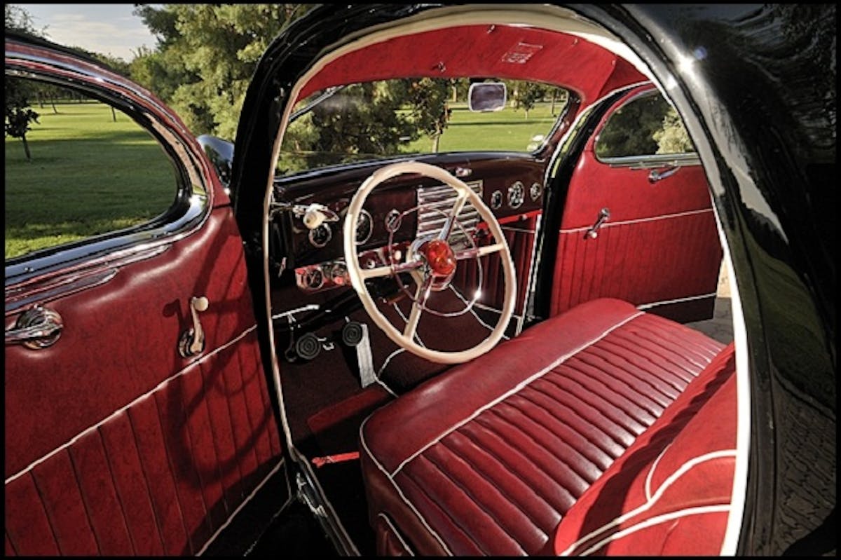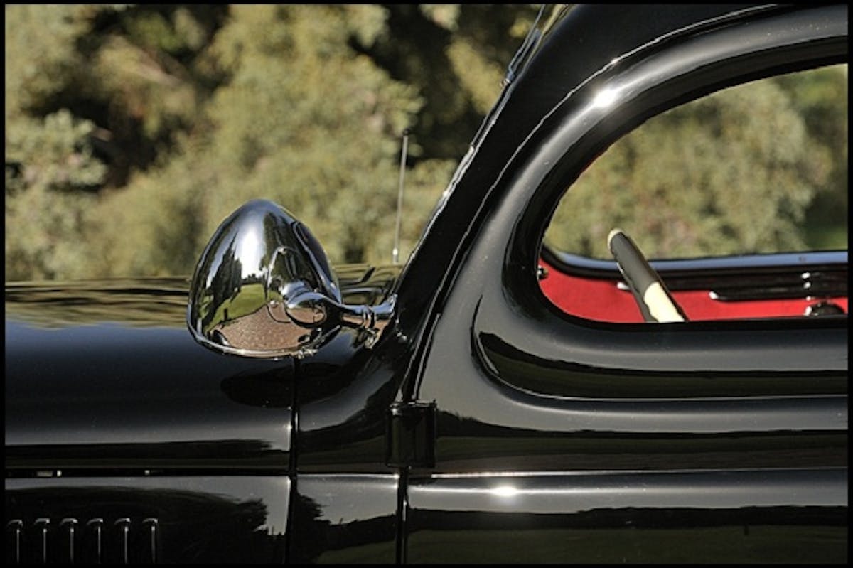 The car also featured louvered side panels, 1941 Hudson taillights, clamshell hood, which was lengthened three inches, and 1941 Ford bumpers with Lincoln overriders. The car was then finished with a sleek coat of black paint.