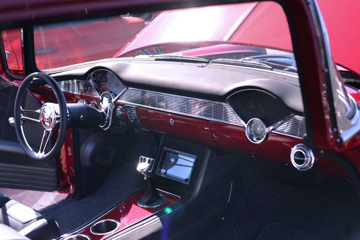 This voluptuous Tri-Five wears a complete TMI Products interior in the Sport R pattern. The front low back seats are covered in charcoal with black suede bolsters and white contrast stitching and are paired with a matching molded fiberglass rear seat. The seats are paired with fiberglass molded front and rear door panels in the same charcoal Sport R pattern. White contrast stitching, heat embossing, and built-in armrests add a tailored look. Finishing off the interior is the complementary fiberglass Sport R Front Console that has been customized with a center shifter and modified cup holder location along with TMI’s full-coverage Premium Carpet Kit.
