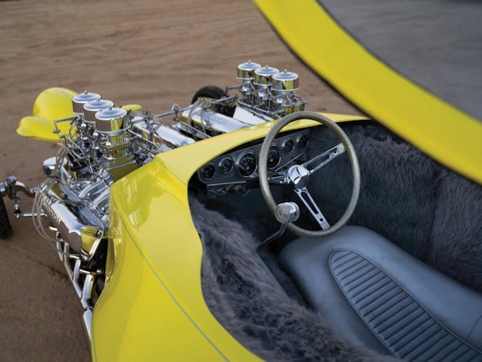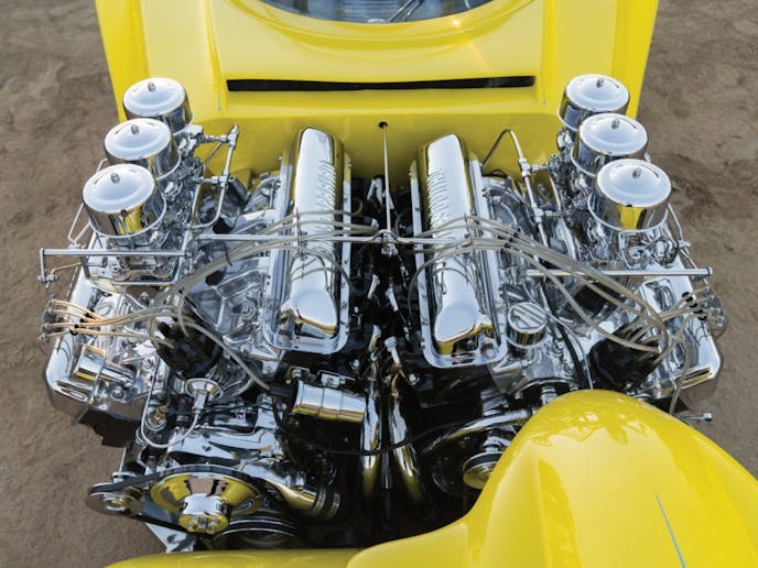 “The “Mysterion,” a radical twin-engine car with a duo of 390-cu. in. Ford big-blocks, was probably inspired by two-engine dragsters like Tommy Ivo’s twin -uick. The engines are tilted and their natural offset permits exhaust header clearance.