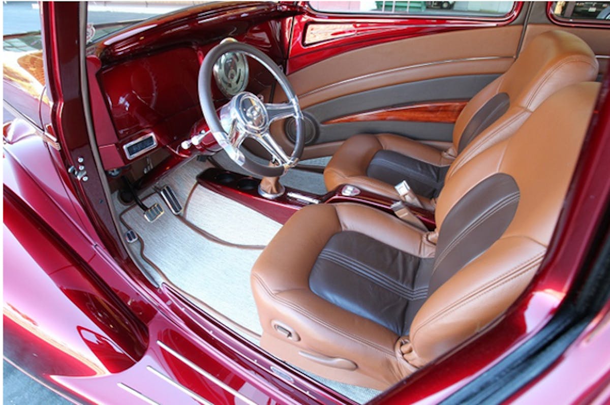 Topping off the street rod’s unique look is a coat of House of Kolor Apple Red paint, which flows effortlessly into the cabin of the vehicle. Inside, you’ll find a reworked stock dash displaying gauges from Classic Instruments, a Billet Specialties steering wheel, leather-trimmed seats with stitching by B&R Auto Upholstery and a matching leather-booted Lokar shifter.