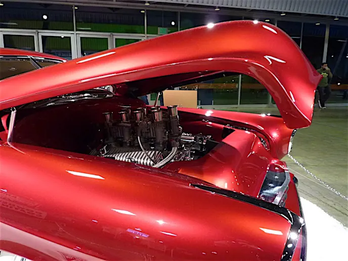 Underneath the shapely sheet metal is just as impressive. The woven orange cloth spark plug leads and Ardun rocker covers give the car a vintage look, but hides a 5.8-liter supercharged V-8, snicked from a Shelby GT500 Mustang packing 660 hp.