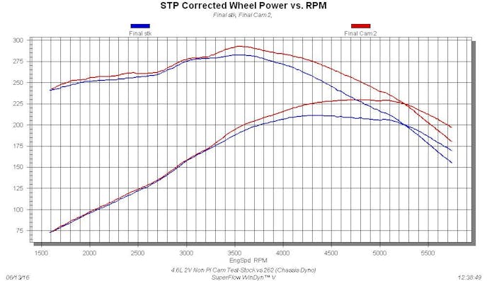 Run on the Superflow chassis dyno with the stock cams, the 4.6L produced peak numbers of 211 hp and 282 lb-ft of torque.