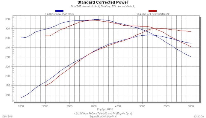 Early 4.6L 2V Cam Test-COMP XE262H vs XE274H (Engine Dyno) After removal of the engine from the Mustang, we upgraded the motor with a fresh short block and ported non-PI heads. We then performed another cam comparison between the XE262H cams and a larger XE274H cams. Run on the engine dyno with the XE262H cams, the modified (early) 4.6L 2V motor produced 308 hp at 5,200 rpm and 349 lb-ft of torque at 4,100 rpm. After installation of the larger XE274H cams, the peak numbers jumped to 326 hp at 5,400 rpm and 347 lb-ft of torque at 4,000 rpm. The wilder cam timing offered sizable power gains past 4,800 rpm, but lost torque to the smaller cams below 3,800 rpm.