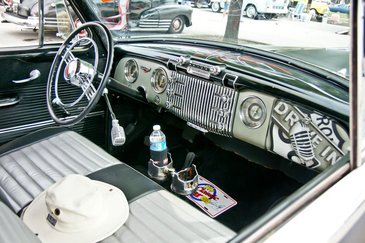 Inside the car is a classic two-tone tuck and roll, black and silver leather seating, which complements the Buick’s exterior paint scheme. The graphics on the dash depict the 1950s pastime of drive-in movies, radio broadcasting, and the historic U.S. Route 66. The theme continues with an old school microphone set in place as the automatic transmission column shifter, and in the back seating area there are drive-in movie window speakers to complete the 50s nostalgic theme.