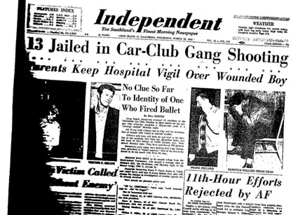 Clubs would hold local events flaunting their custom creations around their neighborhoods while other clubs would join in to flaunt off their own. With blood boiling about whose was better and whose was faster tempers would flair into violent outbursts. One notorious example of the territorial battles happened in Artesia, California, March 1959. While hosting a meeting with 16 members the Dutchmen CC suffered a brutal attack by the Townsmen CC’s alleged 30 members. The rumble took place at the Moose Lodge Hall on E. Artesia Blvd, March 25th. One of the members, Neil Mahan, received a serious brain injury from a gunshot wound that eventually lead to his early demise during the attack. The assault happened in retaliation to an earlier altercation where a Dutchman attacked one of the Townsmen with a railroad spike