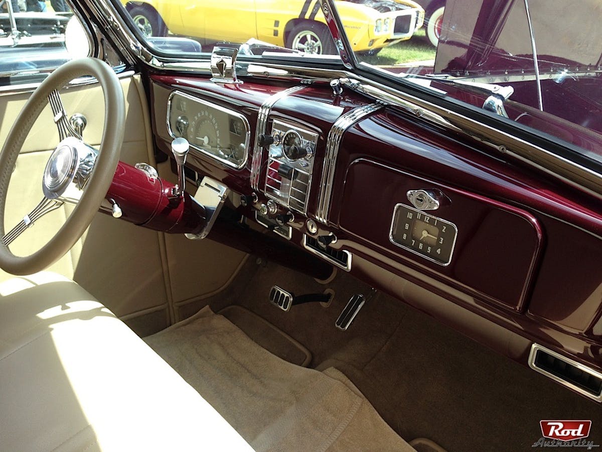 Observing the immaculate and plush interior, the tan and maroon combo complement each other nicely. Complete with a stock seat, the tan leather is plush and the tilt wheel also adds a slight modern touch to the 88 year old classic car.