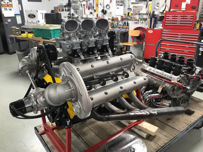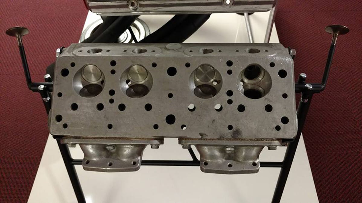 With its four, gear-driven camshafts located above the over-head valves, the Davies OHV flathead conversion could easily win the Buck Rodgers Award for most futuristic appearing. Later versions were driven by a belt, but these are the earlier shaft-driven versions. A pair of these heads appeared at Indy in the Bob Estes Special in ’51, having been run the previous year with an Ardun flathead.