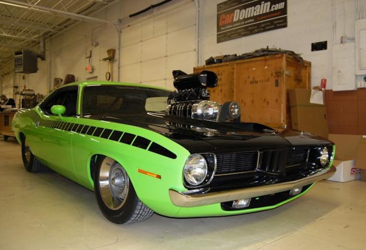 Nonetheless, the ‘Cuda does a good job of resembling ’70 AAR ‘Cuda, in almost perfect J5 Limelight Green (one of the high-impact colors that mother Mopar created for her muscle cars during early ’70s), shoulder-line strobe stripe ending in a customized “AARP” logo instead of the original “AAR,” and blacked out AAR fiberglass hood (which would work if there wasn’t a two foot tower of power jutting out of it).