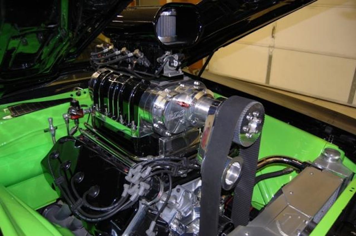 Nonetheless, the ‘Cuda does a good job of resembling ’70 AAR ‘Cuda, in almost perfect J5 Limelight Green (one of the high-impact colors that mother Mopar created for her muscle cars during early ’70s), shoulder-line strobe stripe ending in a customized “AARP” logo instead of the original “AAR,” and blacked out AAR fiberglass hood (which would work if there wasn’t a two foot tower of power jutting out of it).