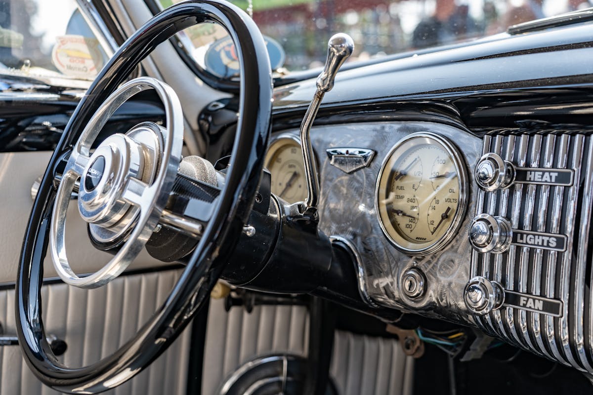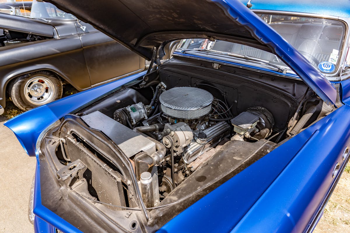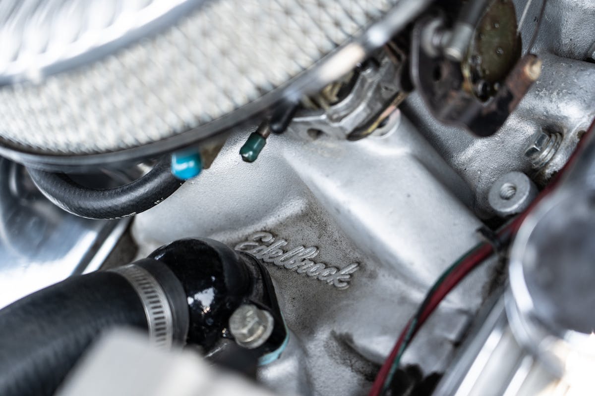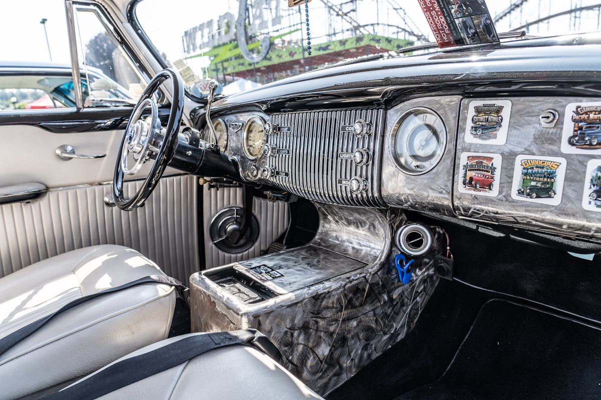 The interior also stands out from rest with a custom console that Alan made. It flows front to back and goes up the rear bench seat creating a bucket seat look. It’s got a clear coated, crushed and scarred bare metal look that perfectly matches that of the front bumpers. The rough cut scars under the glossy clear create an interesting contrast that really lend themselves well to each other. The center console is a unique custom touch, one that really attracted us to this car.