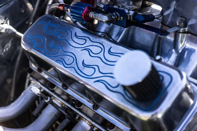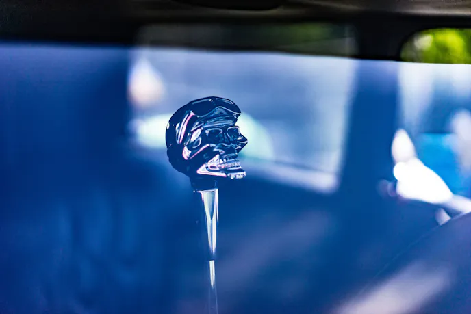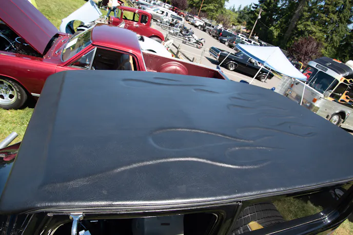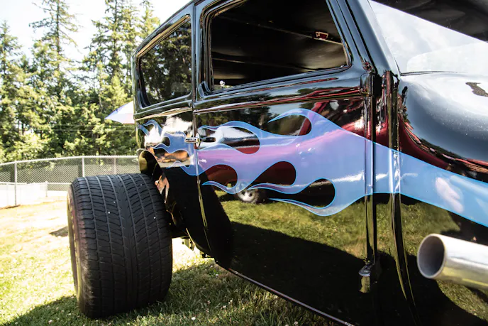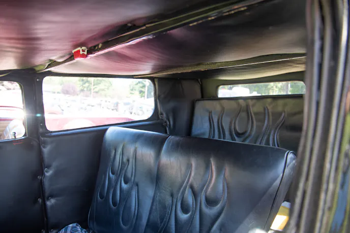 The interior is also just about as cool as the exterior, where the seats match the flame design that is impressed onto the vinyl top, and the instruments are all aftermarket gauges for style and accuracy. The shift handle is a really cool, custom skull that sits high on an old-school floor shifter.