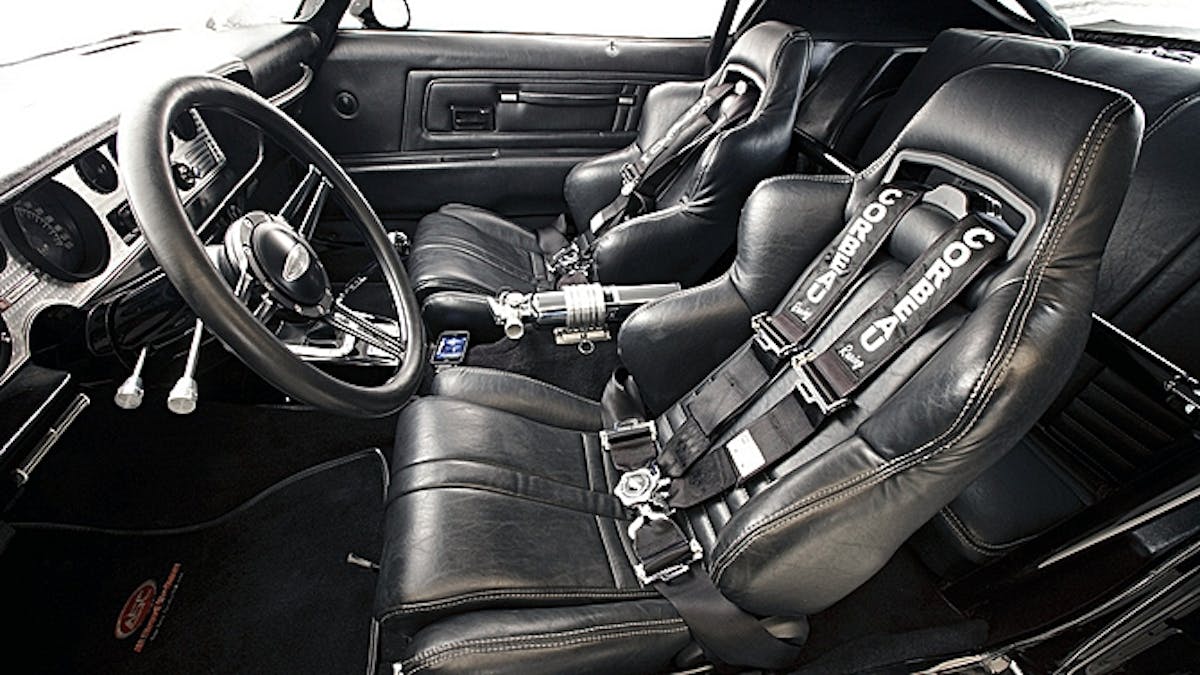 Now just to rial the masses once again, let’s take a look at what this beast is made of. The Firebird still maintains all its custom body work, 480ci Pontiac engine fitted with twin 66mm Bullseye turbochargers, a Moser 12-bolt rearend with 3.55 gears, Rockland Tranzilla T56 6-speed transmission, Wilwood brakes and a Detroit Speed Engineering suspension system. Custom components on the car include a custom hydraulic roller camshaft from COMP Cams, a billet Visner intake manifold, custom air-to-air intercooler, stainless manifolds and headers, custom plumbing, a steel aero package and custom Forgiato Ritorno wheels.