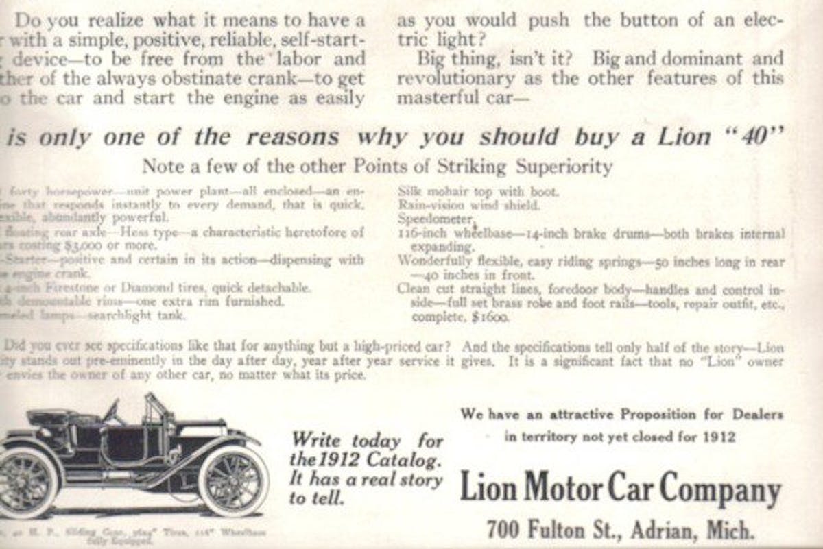 Adrian, Michigan, had been known as the Fence Capital of the world after a local inventor had discovered how to manufacture wire fencing. The wire fence business was moving to other areas like Pennsylvania and New Jersey, so having a start up automotive company take up residence in the small town was a welcomed. The auto company moved into the Lion Fence Company plant, took over the Lion name and producing their own products.