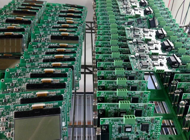 A Heller wave solder machine is used to solder electric components onto the printed circuit boards. The components are placed on the PCB and the loaded PCB is passed across a pumped wave or waterfall of solder. The solder wets the exposed metallic areas of the board (those not protected with solder mask that prevents the solder from bridging between connections), creating a reliable electrical connection. The process is much faster than manual soldering of components.