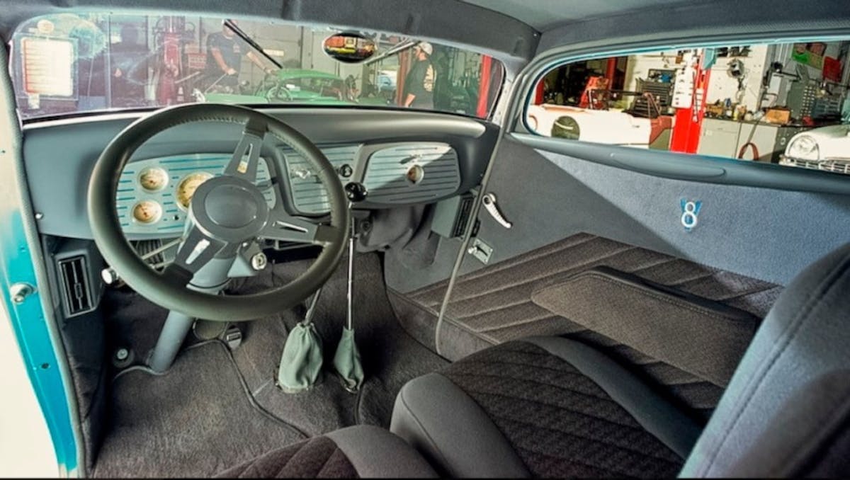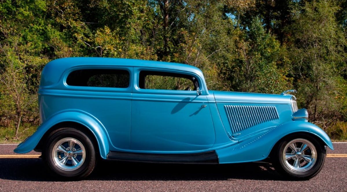 Check out this 1934 Ford 2-door sedan, (Lot #F29) that will go on the block at Mecum on September 7th-8th in Louisville, Kentucky. We especially dig this ’34 because of the deft 3″ chop, the great color and perfect stance. The interior reveals an older build as the gray tweed/velour is tidy and well done but now long-in-tooth. We always think erring towards retro or an era appropriate theme is the best bet but who knows? The shiny billet, ZZ Top “Eliminator” thing could be all the rage again some day. What goes around comes around.