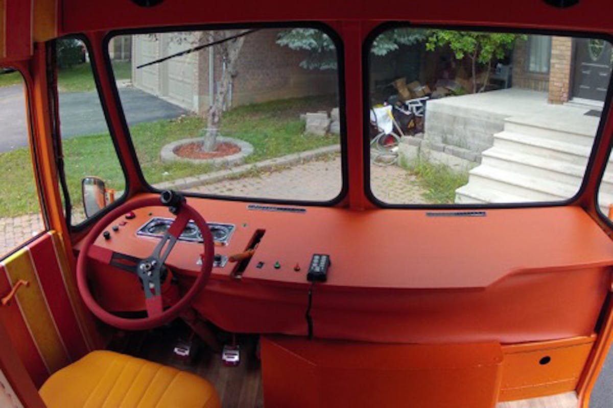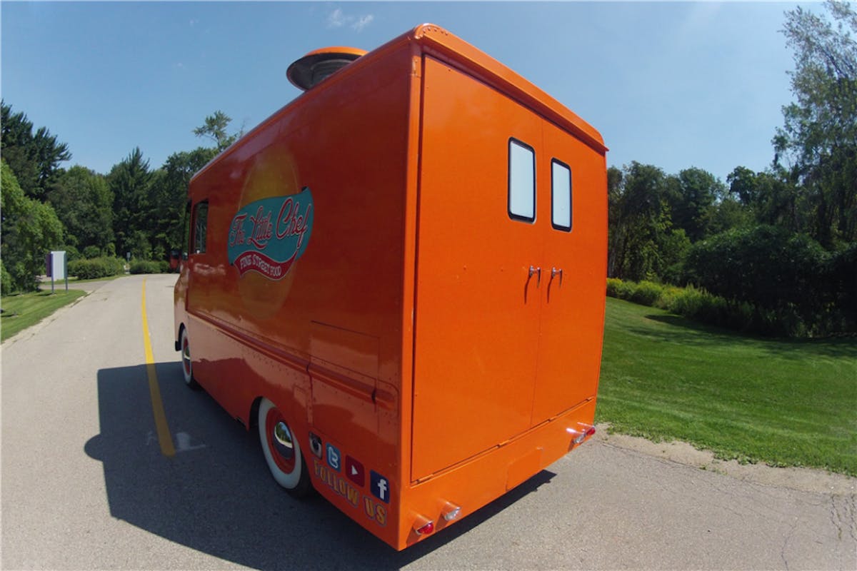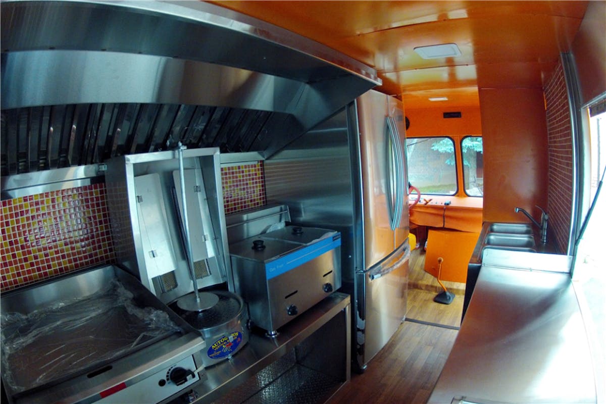 The truck has been finished inside and out with House of Kolor custom orange paint and is equipped with whitewall tires, PA system, LED lights, stereo system and rebuilt brakes, suspension, bumpers, front grille, dash, seats, floor, steering wheel and chrome handles. Additional equipment includes: a double fryer, flat griddle, and a charbroiler grill.”
