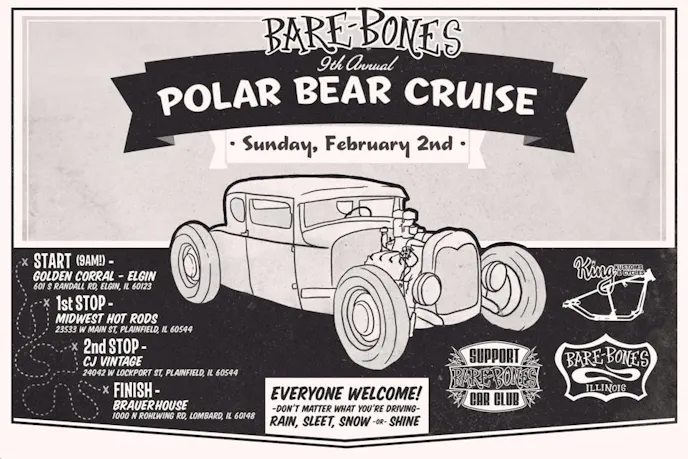 The cruise will start at the event’s traditional rendezvous point, Golden Corral in Elgin, Illinois at 9:00 a.m.. After a hardy breakfast there will be two stops, Midwest Hot Rods first and then CJ Vintage, both in Plainfield, Illinois. The cruise will end at Brauer House, a restaurant/venue in Lombard, Illinois. In total, the cruise is around 66 miles. According to weather forecasts, the day of the cruise is set to be partly cloudy with a high of 25 degrees Fahrenheit.