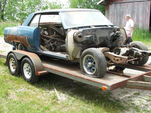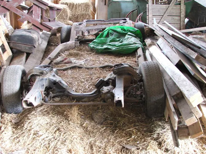 He was getting pretty ill and the car was sitting for a while, so he asked a friend to store the car for him in his barn. The friend obliged, and they put the frame in one stall, the body went into another, and parts were stored here and there. Years had passed and the original owner had passed away before he got a chance to work on the car again.