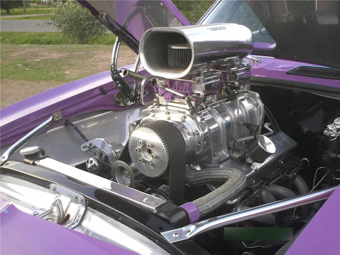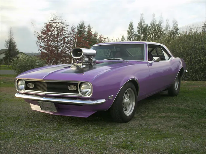 If you like purple, you’ll like this Camaro as it even has some purple on the race-buckets inside with some roses sewn in. But, if that’s not your thing, you can quickly get over it when you put the hammer down and wake up the 350 small block with the 6-71 Blower Drive Service supercharger sitting on top.