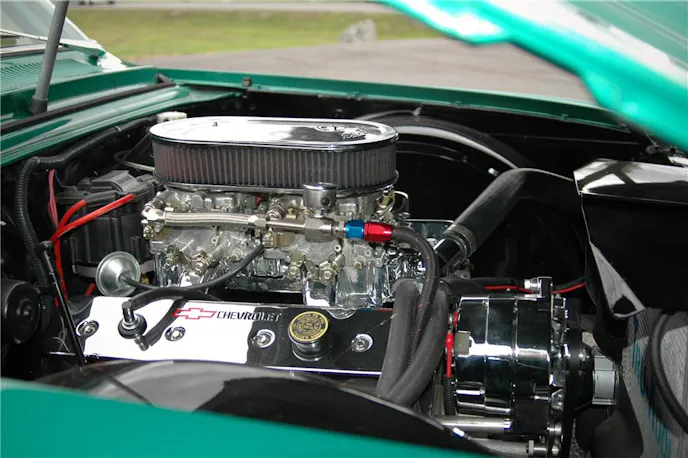 Under the hood sits a pair of Edelbrock carburetors for helping to motivate the crate engine, with lots of polished parts and detail in the engine compartment. The black and teal green two-tone paint fits the overall aesthetics of the car, making it unique and collectible.