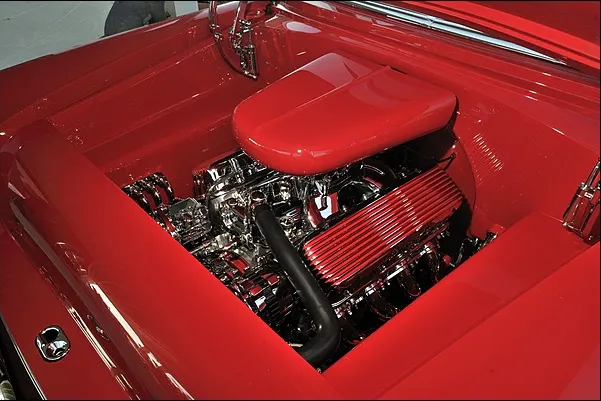 The body started out as a rust free two door ’55. The entire car was stripped and then treated to a dip in a rust proofing compound. Custom touches abound throughout the build. The wheel openings have been reworked, the exterior trim has been shaved and minimized and the beautiful red paint looks as deep as if you were staring straight into the PPG mixing vat itself.