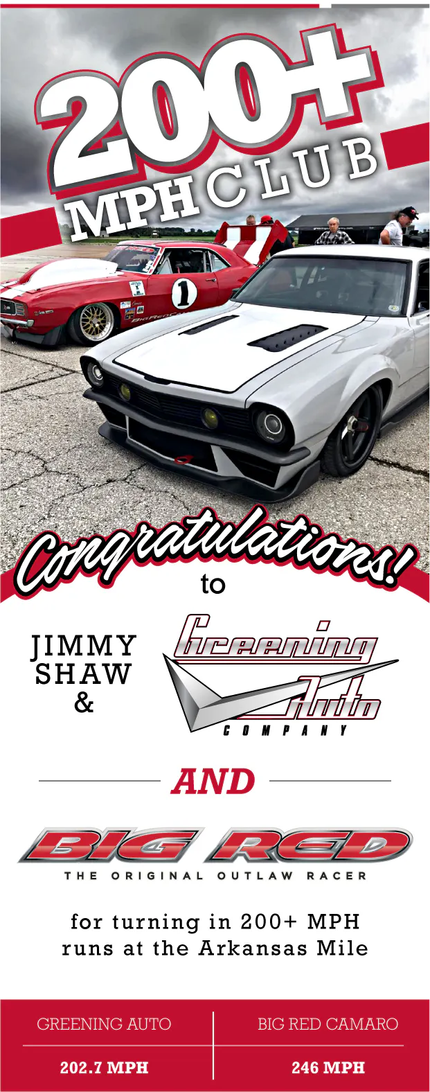 We got word from our friends over at Baer that Big Red was at it again a couple weekends ago. They turned in another 200+ MPH time slip at the Arkansas Mile. For those of you who don’t know, they did so by pushing that Camaro to it’s absolute limits. It’s powered by a 2000+hp 555 cubic-inch Procharged V8.