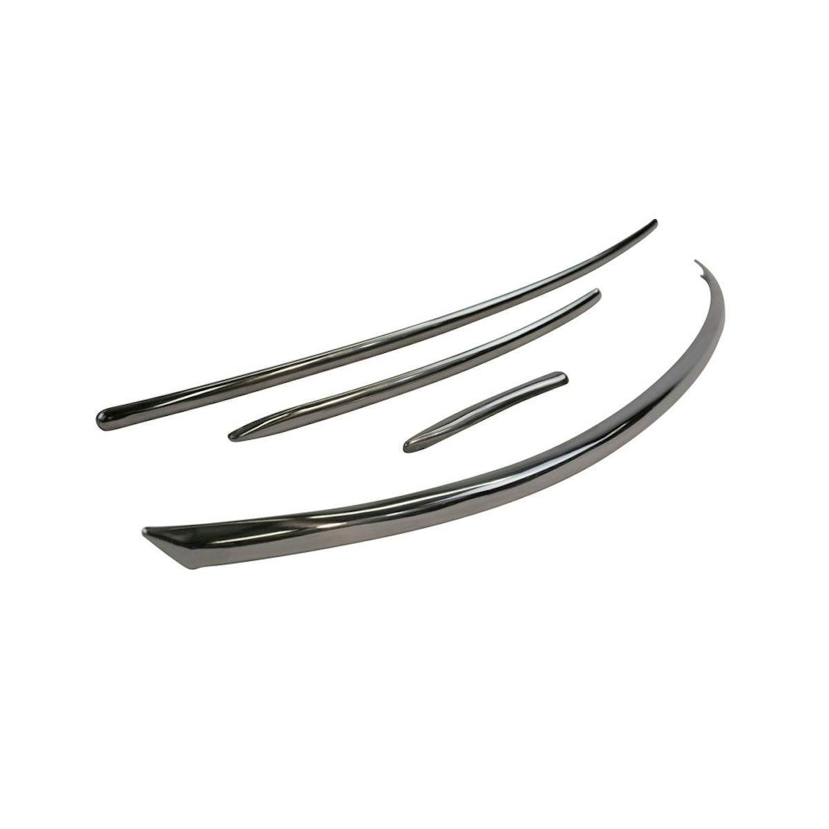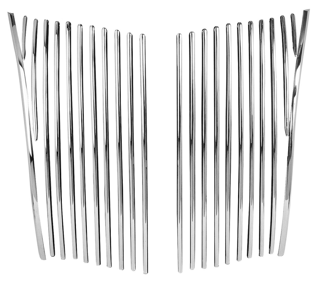 Precision roll-formed in high quality stainless steel, each individual piece has been sized the correct length and width, curved to match the bow of the mating grille bar and finished with a finely shaped rounded end. No expense was spared in producing these matchless beauties.