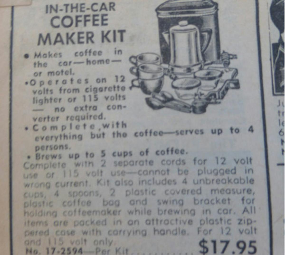 Nothing says over-the- top like an in car coffee maker from J.C. Whitney. Photo from {link=https://www.autoblog.com/2015/02/28/10-oddest-jc-whitney-auto-accessories/#slide-3367624}www.autoblog.com.{/link}