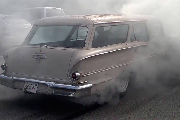 YouTube user boatman936 documented a great burnout by a 1958 Chevrolet Brookwood wagon, but alas … things went awry. As the driver begins to destroy the rear tires, the car continues to scoot forward. Perhaps the brakes were not adequate or the engine was too powerful, but it finally comes to stop and that is when the smoke show really gets started.