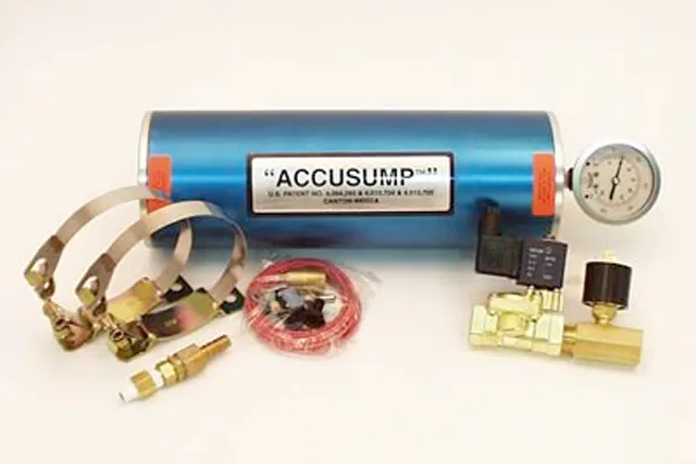 Adding to the design of their baffled oil pans, Canton is well known for their Accusump oil accumulators, too. While their baffling inside their oil pans help keep that oil in place, the Accusump comes in handy when oil pressure is low. Low oil pressure happens during cold starts, as wellas during hard racing when the engine revs are high and the inertia may cause low levels in the oil pan where the pickup tube is located.