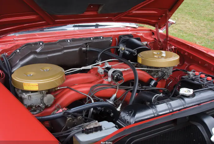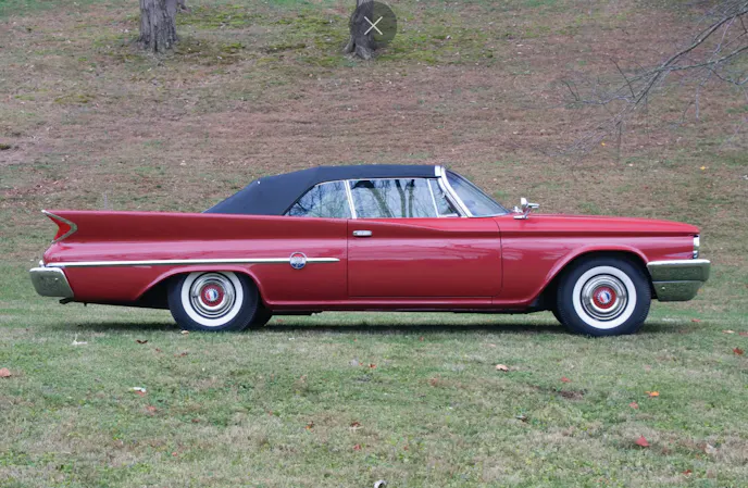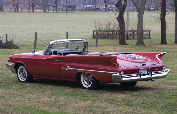 The 1960 Chrysler 300F stands out for its distinctive style and gigantic tailfins. It was a year when Chrysler took the Forward Look further, in design and performance. The 300F boasted a 413-cid V8 engine that delivered 375 horsepower, thanks to its two Carter AFB four-barrel carburetors and a unique cross-ram induction manifold.