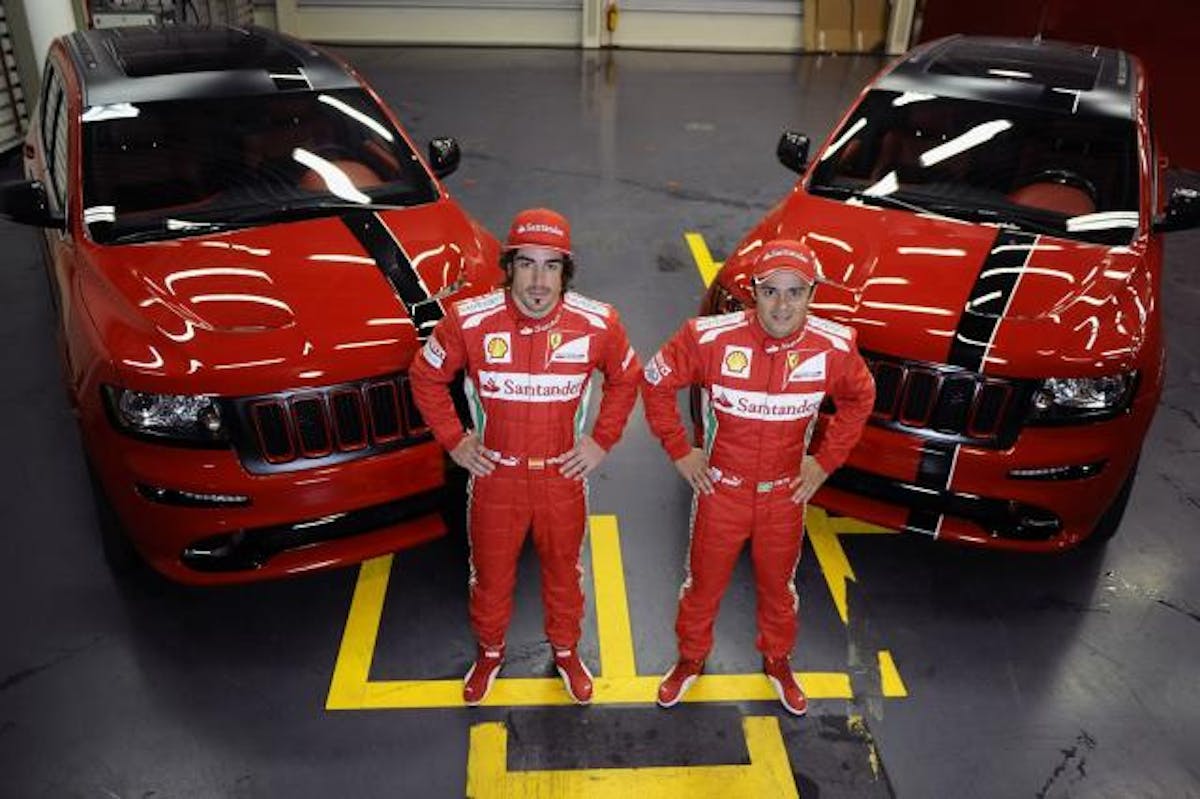 And the first vehicle to get the Ferrari once over is none other than the Jeep Grand Cherokee SRT8. Carscoop reports that a pair of specially-prepared SRT8 Jeeps were handed over to Scuderia Ferrari racing drivers Felipe Massa and Fernando Alonso.
