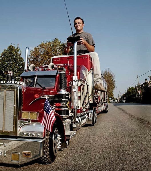 Wait until you see this Peterbilt come to life, run, and sound like the real deal. What’s more, it’s not only built to scale, perfectly but it’s scary real. Although there is no way of actually sitting down in the drivers seat, the owner did the next best thing…he takes a ride sitting Indian-style on its trailer.