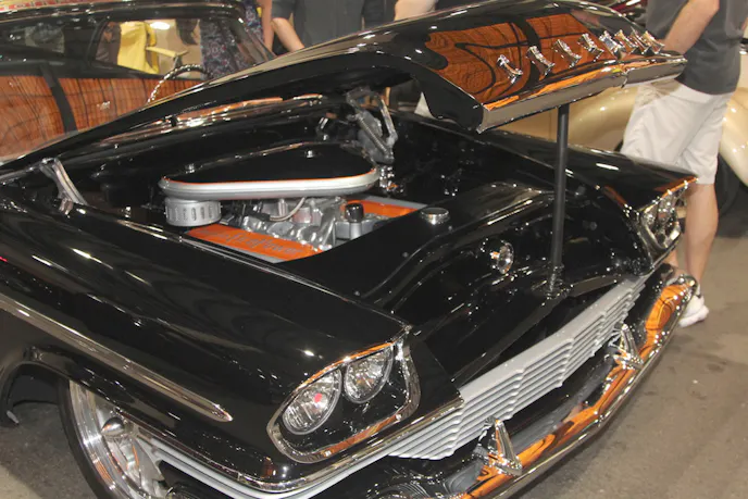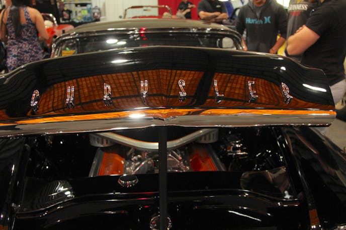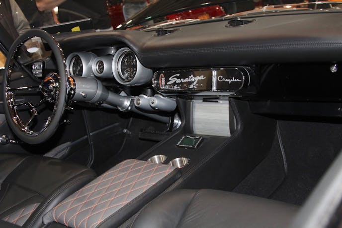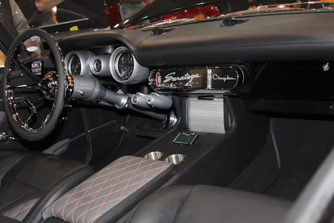 For the one that we caught at the Goodguys Del Mar event, we couldn’t find Brice the owner to get the details, but it was clear that the transmission hanging behind the V8 Hemi was Chrysler’s famous and virtually indestructible TorqueFlite 3-speed automatic. The interior was fully custom with a dash and steering wheel unlike any that we’ve seen in a Saratoga model before.