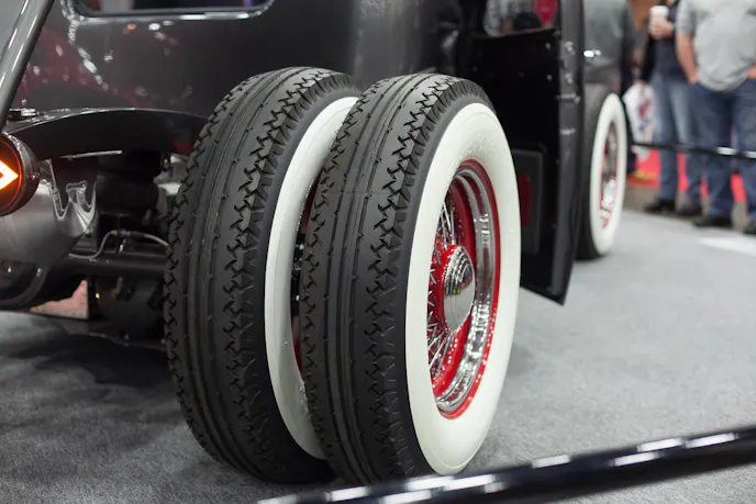 No, your eyes are not deceiving you, those are dually-style white walls sticking out from underneath a custom fabricated tilt bed.