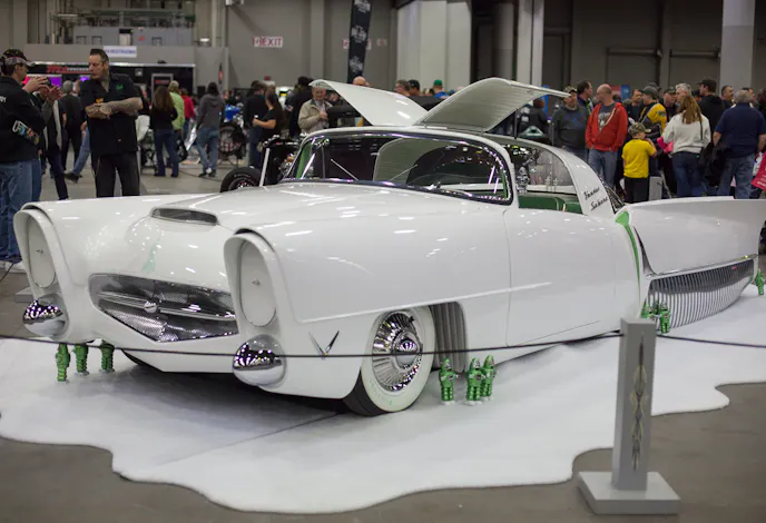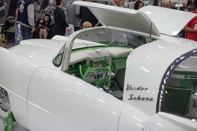 When it comes to kustom cars “VooDoo” Larry Grobe is a legend, and his present to Autorama for it’s 65th birthday was bringing ‘Vodoo Sahara’, his extremely custom ’54 Kaiser Manhattan, to Detroit. Nintey percent of the body on this car is hand made, which is impressive because it was easily one of the longest cars at the show.