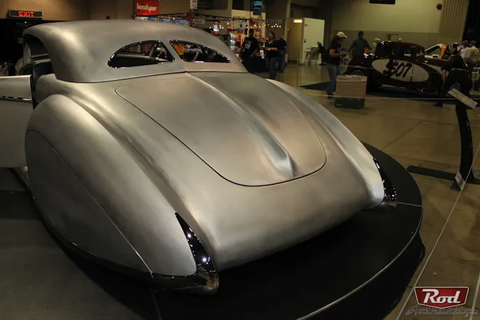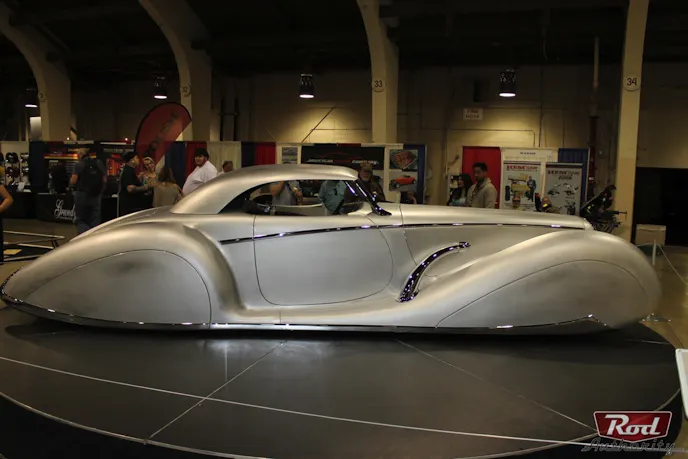 The flowing teardrop body is complemented by aggressive details like the beautifully scalloped side pipes. Enclosed pontoon fenders carry chrome rearward while the ornate DuVall-style windshield and lift-off hardtop exude early hot rod spirit.