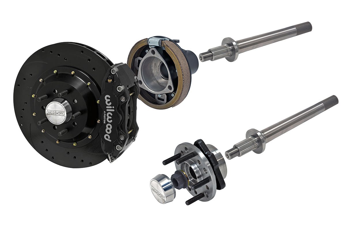 Today’s top pro-touring vehicles often push the reliability and safety limits of standard flange-style axles that are commonplace on most muscle cars. Chassisworks solution to raising the performance ceiling is a complete floater-axle and brake system designed specifically for the leading-edge pro-touring market. Identical in performance and safety benefits to race-style floater systems, Chassisworks’ system also integrates an optional drum-style parking brake mechanism for more practical use on street-driven vehicles. The floater system features a tapered-roller unit-bearing that is larger, stronger, and more reliable than the Corvette ZR1 bearing. The unit bearing bolts to a specially designed housing end, removing all weight and bending load from the axles. The axle is left with the sole purpose of transferring torque to the wheels and can then be designed as a simple axle shaft with splines at both ends. Recent development of 35-spline differentials for Ford 9” and Chevy 12-bolt rear axle housings allows you to take advantage of the Chassisworks 35-spline axle with its significantly increased strength over smaller 31-spline axles. To provide ample braking force for sometimes 14” and wider tires, brake kits are offered with 14” or 15” x 1.25” vented and cross-drilled rotors, with 4-piston Wilwood or Baer radial-mount calipers.