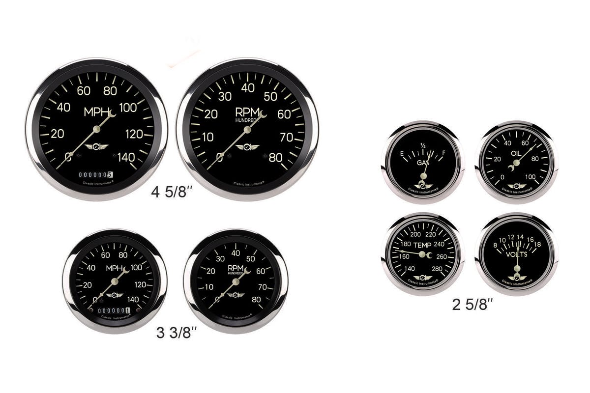 Classic Instruments has just released their all new Classic Series. This series fuels nostalgia for the traditional days of hot rodding while integrating the reliability and convenience features of today. The rugged air-core movement and all electronic components provide an instrument with a high level of versatility, quality, and accuracy. Classic Instruments is pleased to introduce with this series, an all-new size offering, 2 5/8″. All Classic Series instruments are available as individual instruments or as part of a five or six gauge set. The series features polished stainless steel radial bezels, curved glass lenses, nostalgic crescent moon pointers, and rich black dial faces.