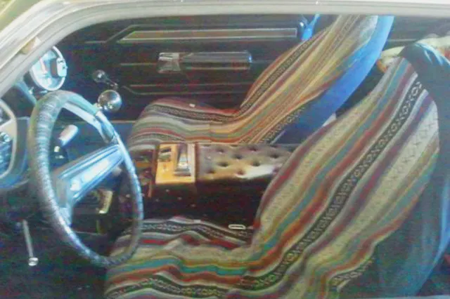 The real kicker is the interior. The factory wrap around dash with skinny, single spoke steering wheel is all there, but it’s the frozen in time mods that are really cool. Check out the JC Whitney horse blanket seat covers, fuzzy 8 balls hanging from the mirror, a hula girl, a rear seat replaced with sweet speakers and the coolest homemade plywood and and tufted velour console you’ve ever seen. With toggle switches no less.