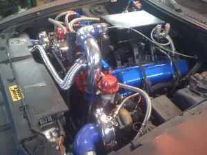 According to the listing, the 1996 Mustang has been retrofitted with a 6.2L GM diesel. He has set it up with a pair of chromed turbos with external waste gates and an intercooler. The exhaust is full 3-inch duals with an H-pipe, exiting the side of the ‘Stang. We can only imagine the sound it would make with the injectors at full squirt! On the inside he’s got it set up with Autometer gauges including speedometer, fuel level, and coolant temperature.
