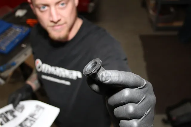 We transferred the MAF sensor from the stock airbox into the AIRAID intake tube and secured it in place using the included 8-32 screws and lock washer. Then we installed the GM coupler onto the throttle body side of the AIRAID intake tube. On the filter side of the intake tube, we installed the hump hose. We then placed the grommet that came with the AIRAID hardware into the hole on the intake tube. We followed that by inserting the barded end of the PCV fitting into that grommet.