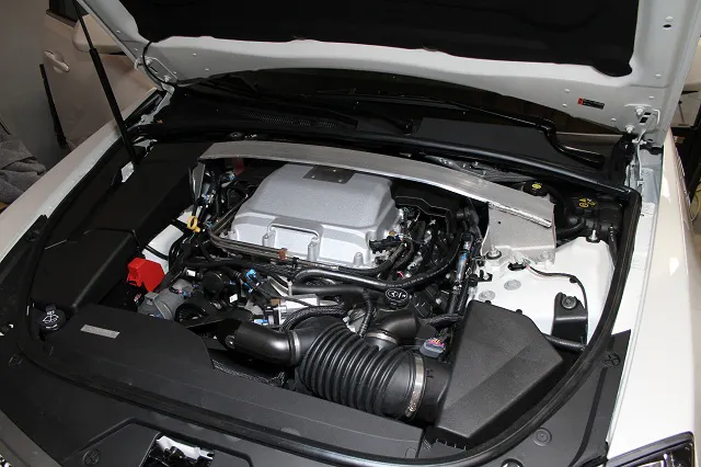 We had to pull out the stock CTS-V intake system before we could put the new AIRAID system on the car. Before we started removing parts, we disconnected the negative battery cable from the battery found in the trunk above the rear passenger side wheel well.