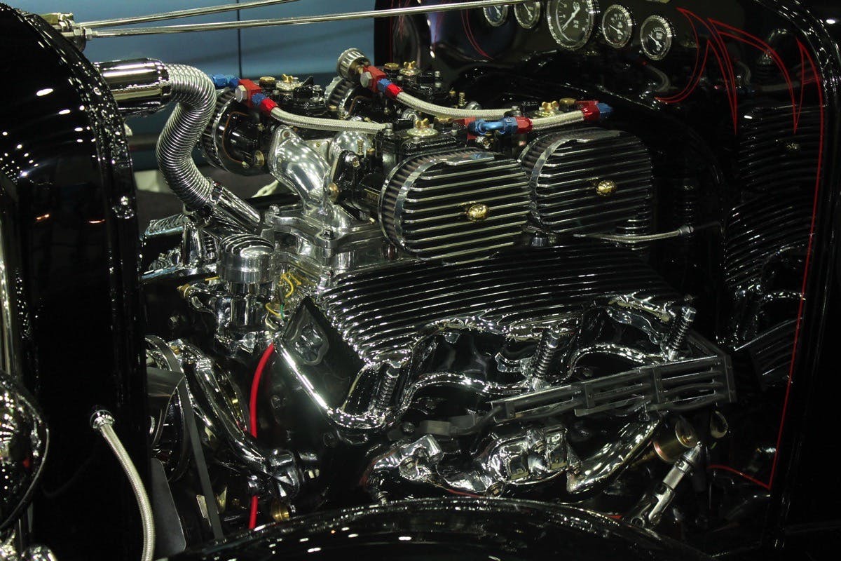 We asked Gerber to point out some details on the Deuce, “Literally everything on the car is very subtle, and at first glance you probably don’t notice a lot of the stuff that’s done. Every piece on it is a one-off specifically built piece. Al Nagele went from designing the shape and profile of the frame rails to where we were routing the brake lines; every crossmember is one-off tubing; every bracket that holds spark plug wires, starter wires, the leather-wrapped accents throughout, the machined wood bows for the headliner; you know, all the little stuff that you take for granted, it’s all been addressed.”