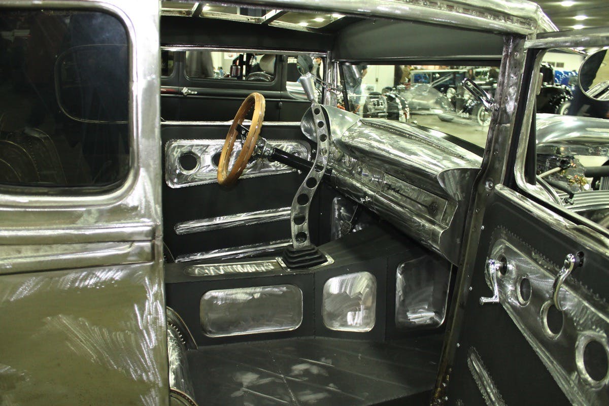 The interior door panels are Kentucky whiskey barrels that have all been cut down and sanded down to achieve the right profile. It features a 5-inch chop, 5-inch channeling, and 4-inches deleted from the bottom section of the car.