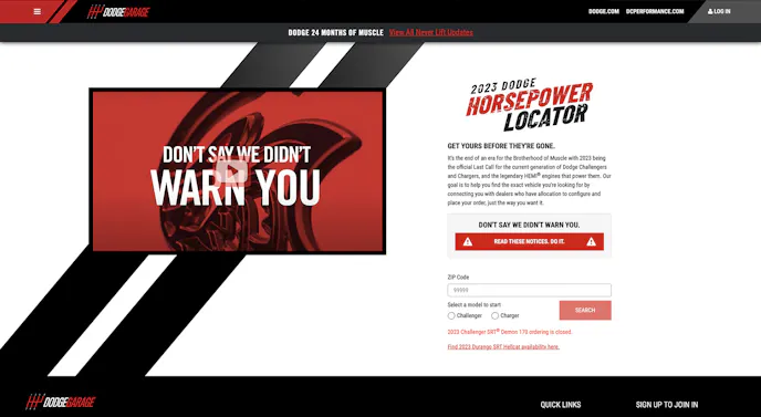 The Dodge Horsepower Locator aids customers in finding their Challenger or Charger by providing information on vehicles still available for ordering through a Dodge dealer. The Horsepower Locator enables enthusiasts to search all Dodge dealerships by zip code, model, and trim level for Dodge Challenger and Charger vehicle order availability.