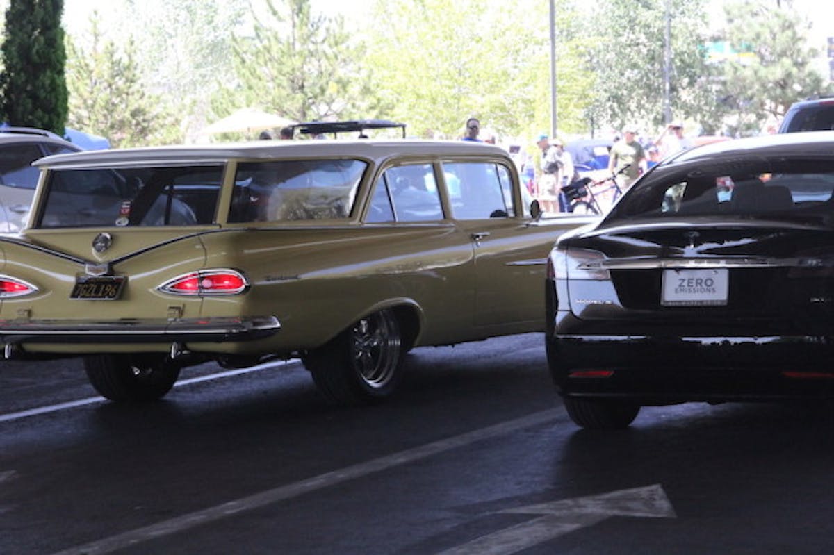 Reno’s Hot August Nights has a fair amount of organized cruises over the eight days, but most of the cars attending the event are drivers and you never know what you are going to see at intersections. Late 60s Camaros line up next to mid-50s Chevys.