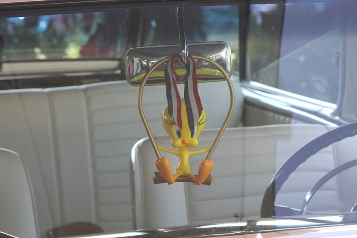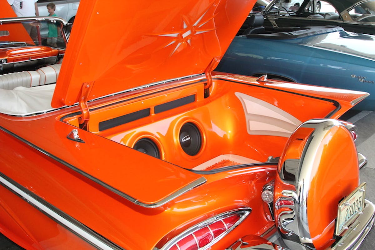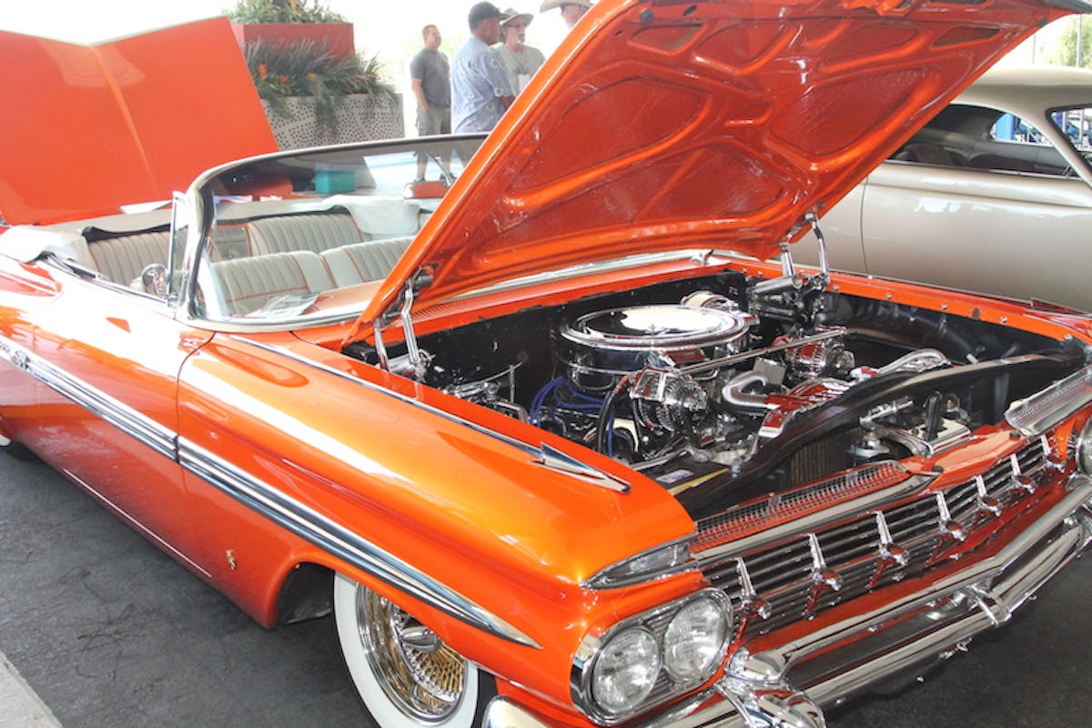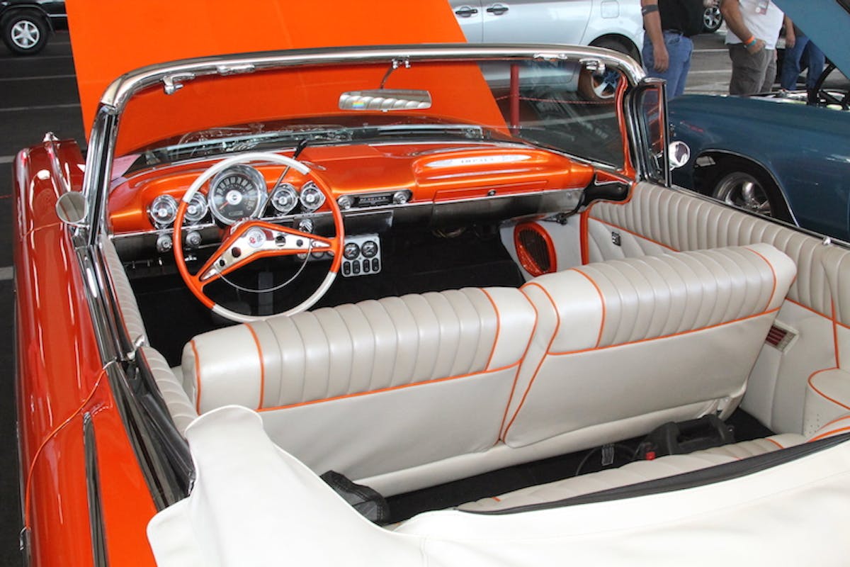 We found Mary and Joe Wallace’s ’59 Imp, painted in a custom blend called “Tropical Tangerine” by Marcos Garcia at Lucky 7 in Antioch, California. The body detail was handled and massaged by Craig Bartels of Craig’s Auto in Spokane, Washington. Motor Works’ Mike Ulrick was responsible for the engine building and Bob Devine did the interior at Devine’s Interior shop. The white interior highlights with the orange base reminded us of a 50/50 ice cream bar, and just as tasty.
