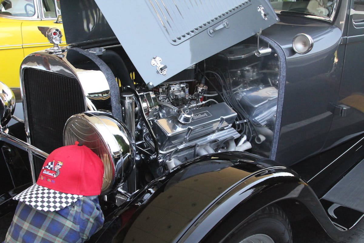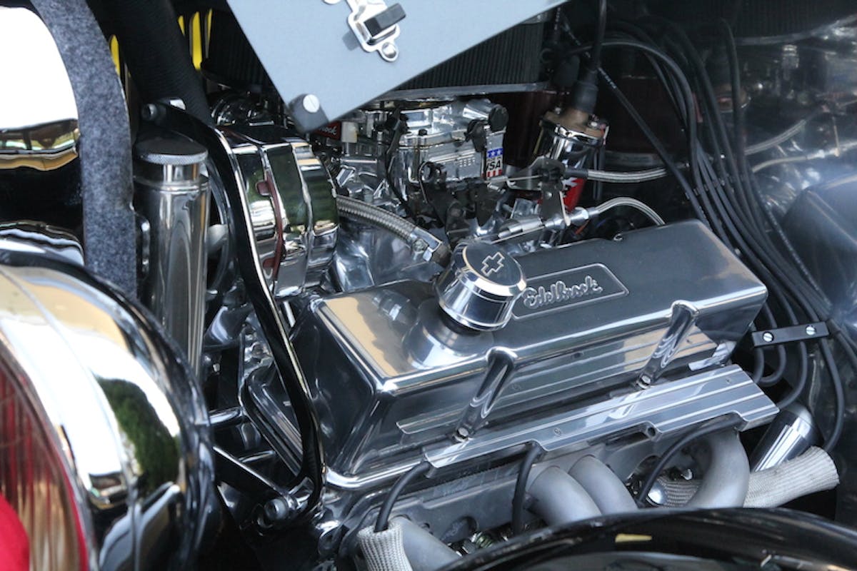 Former Edelbrock supervisor Chuck Davidson’s black and gray 1928 Dodge Sedan with an Edelbrock 400 cubic-inch small-block Chevy project engine, completely tuned and tested on one of the Edelbrock engine dynos, made an appearance at the GSR show and shine.