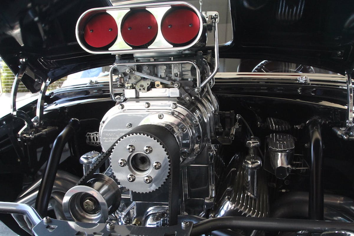 The drivetrain consists of a Redline Performance built 540 ci Dart Big M big-block with 4-bolt mains. A Littlefield 8-71 blower with dual 950 cfm blower adaptive carbs and Dart aluminum Pro-1 cylinder heads. This combination puts out 843 horses at 6,500 RPM. Mounted behind the big-block is a 6-speed Tremec Transmisson with McLeod hydraulic clutch. A Ford 9-inch rearend with 3.73:1 positraction gear ratio provides the final drive.